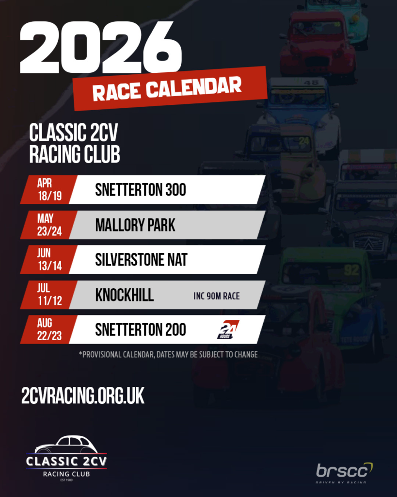 Following the announcement that the Classic 2cv Racing Club will be moving to BRSCC from 2026 and beyond, the calendar for the 2026 season can be found below.