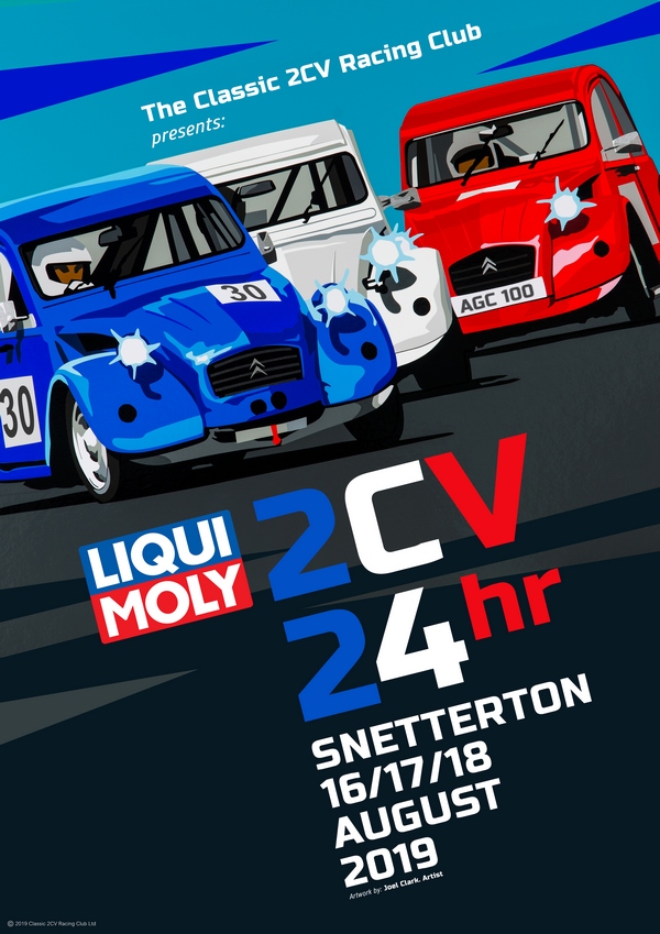 This poster by artist Joel Clark advertises the 29th running of the 2CV 24 Hour race, pays homage to Andre-Gustava Citroen starting his company 100 years ago and celebrates 30 years of 2CV racing in the UK.